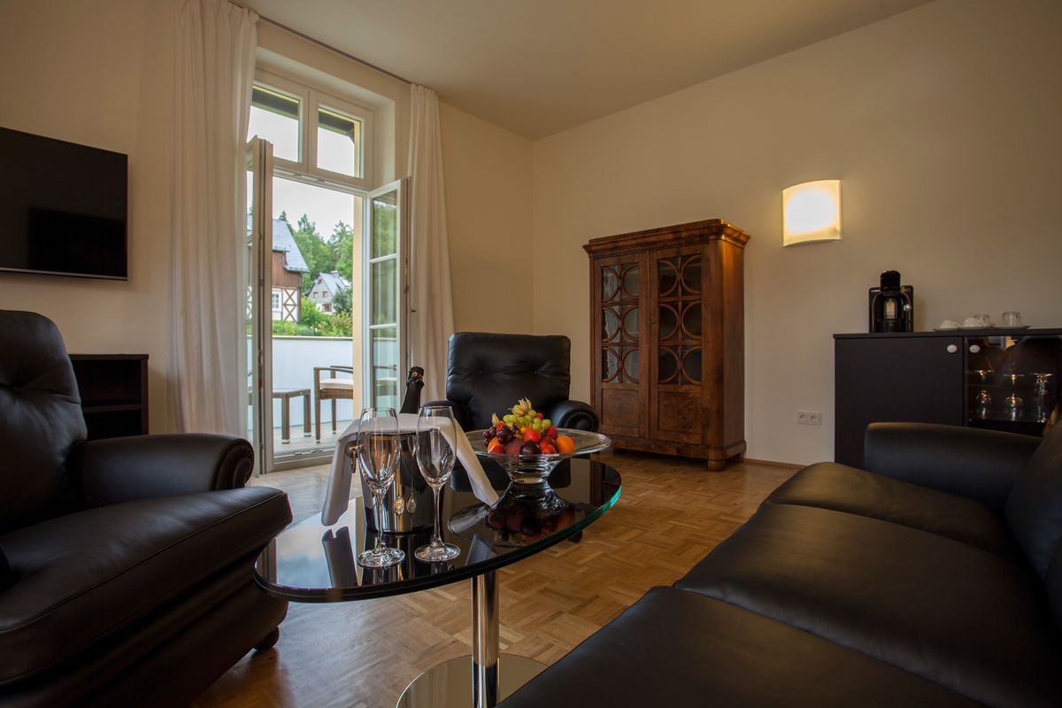 Wohnzimmer: italienische Ledermöbel, kostbare Antiquitäten, edle Stoffe, Gemälde im Altmeister-Genre