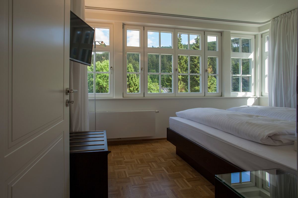 2 Schlafzimmer mit je einem Doppelbett, moderne Echtholzmöbel, edle Bettwäsche, Flachbild-TV