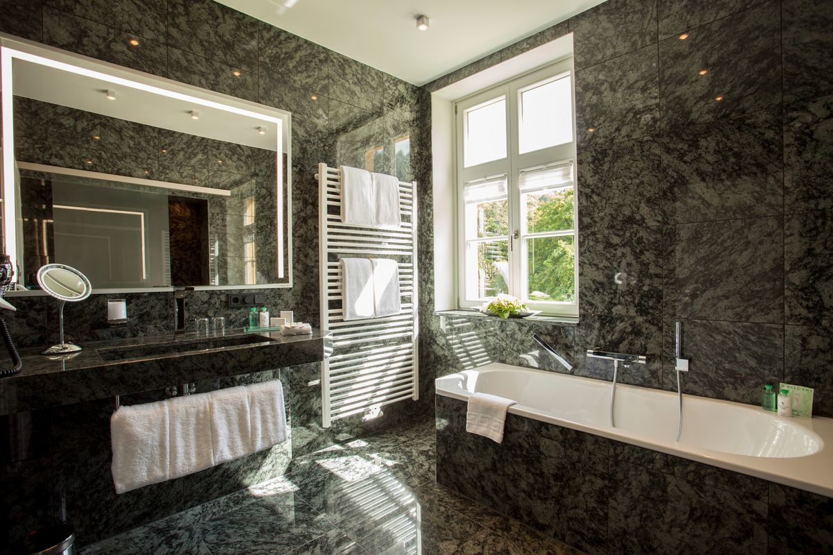 1 Badezimmer aus Granit: Fußbodenheizung, ebenerdige Dusche, luxuriöser Granitwaschtisch, teils auch mit Badewanne