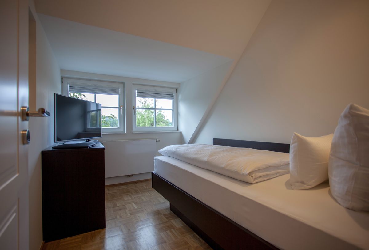 1 Schlafzimmer mit Einzelbett, moderne Echtholzmöbel, edle Bettwäsche, Flachbild-TV und Ausblick in nord-östliche Richtung